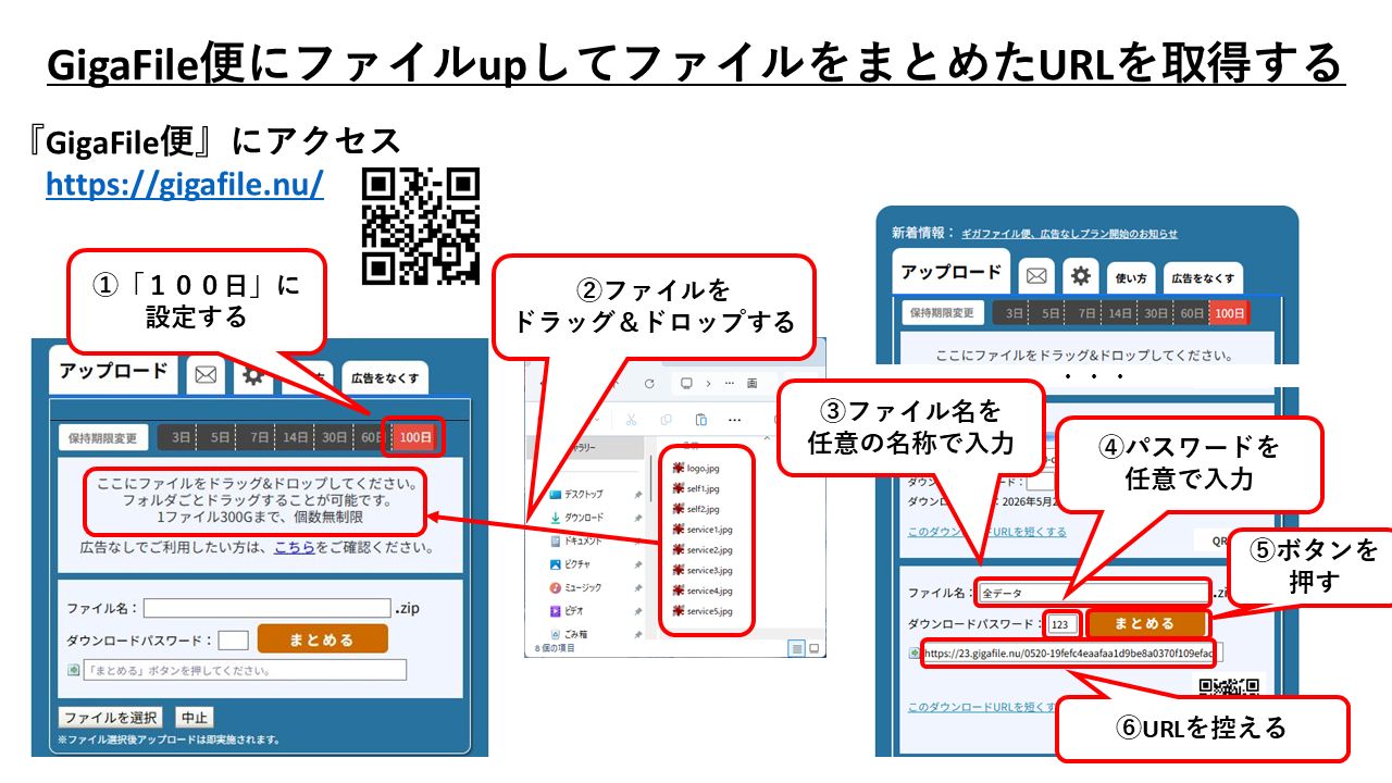 その後、もう一つの下図のとおりに、Giga File 便にアクセスして、ファイルをアップロードして、そのファイルをまとめ、そのURLとパスワードを控えます。このURLとパスワードは、次項で使用します。